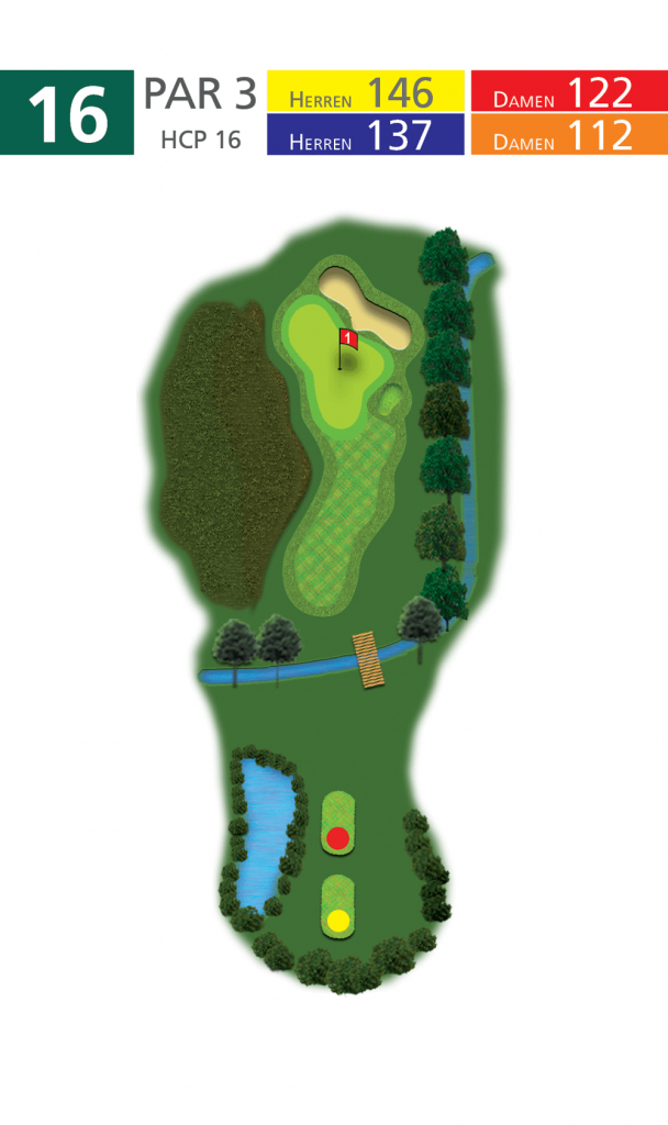 Diese kurze Bahn führt durch eine Lücke in einer Baumreihe hindurch auf ein sehr schmales Fairway, das links durch ein unter Naturschutz stehendes Feuchtbiotop und rechts durch eine Eichenallee gesäumt wird. Unmittelbar hinter dem rückwärtigen Grünbunker verläuft ein Bahndamm, auf dem ab und zu ein regionaler Bummelzug verkehrt.