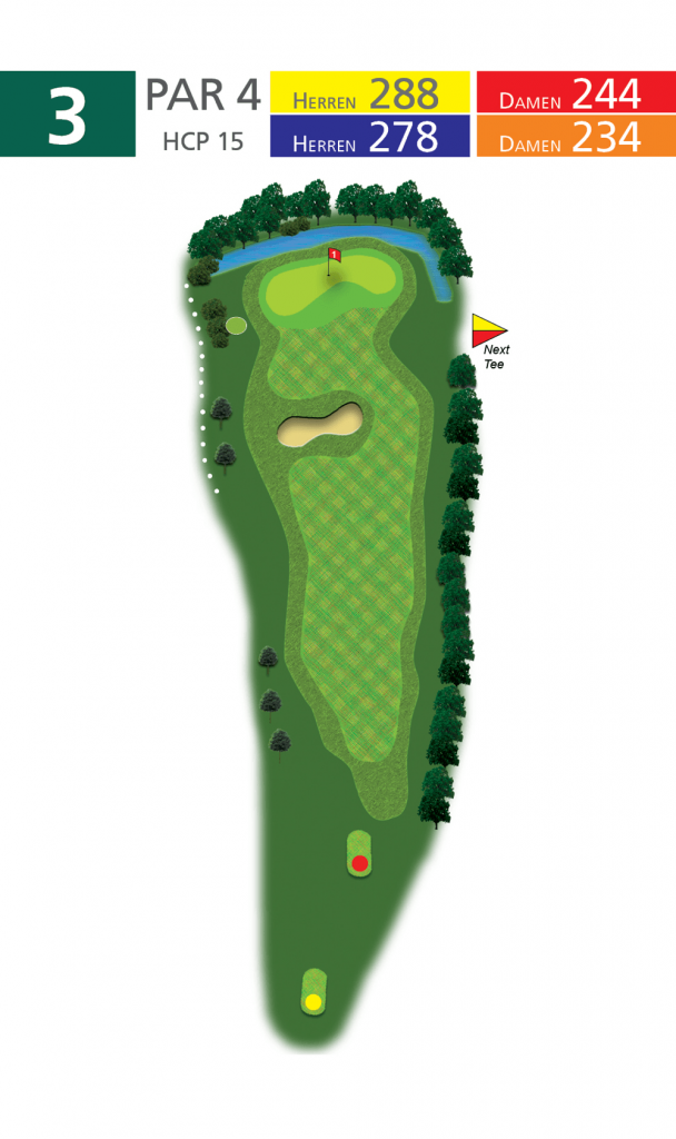Das kürzeste Par-4-Loch des Platzes bietet vom Tee aus einen reizvollen Überblick über den nördlichen Teil des Golfgeländes. Vor allem bei dem meist herrschenden Rückenwind ist das Grün vom Abschlag aus für sehr lange Spieler mit einem guten Drive fast in Reichweite. Der Drive erfordert allerdings einen Carry von über 240 m über einen mitten im Fairway gelegenen Sperrbunker hinweg, so dass es in der Regel ratsam erscheint, den Abschlag vor dem Bunker zu platzieren. Die Approach-Zone ist mit Semirough ausgestattet, so dass ein flacher „bump-and-run-shot“ nach schottischem Vorbild hier nicht möglich ist, sondern ein Anspiel durch die Luft erfordert. Das Grün ist extrem breit und erlaubt daher eine große Variation an Fahnenpositionen, aber es ist nur ca. 12 m tief, und unmittelbar an der Hinterkante verläuft ein tiefer Graben, der jeden zu lang geratenen Ball schluckt.