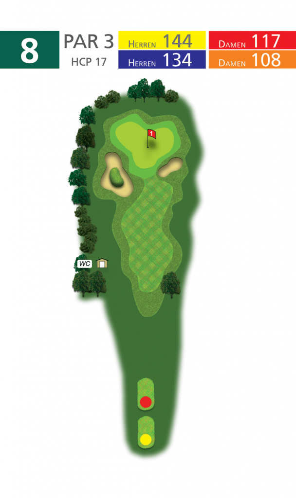 Dieses kleine Loch, das kürzeste des Platzes, wirkt vom Abschlag aus ganz harmlos und leicht zu bewältigen. Aber Vorsicht: hier wurde eine „Falle“ eingebaut in Gestalt eines „blinden“ Bunkers rechts vorm Grün, der zusammen mit dem linken, sichtbaren Bunker nur einen sehr schmalen offenen Eingang zum Grün zuläßt. Durch die unsichtbare Lage des rechten Bunkers unterliegt der Spieler zugleich der optischen Täuschung, dass das Grün näher liegt als die vermessene Bahnlänge.
