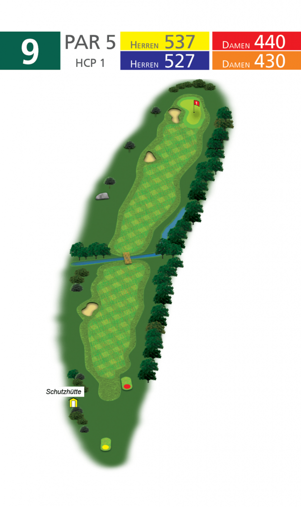 Die Bahn führt auf ganzer Länge immer hart an einer alten Eichenallee am rechten Bahnrand entlang. Für Longhitter wird die Drivezone links durch einen Fairwaybunker eingeengt, während kürzere Spieler eher das Problem haben werden, den Graben in ca. 300 m Entfernung vom Abschlag mit dem zweiten Schlag zu überwinden. Von hier aus steigt das Fairway bis zum Grün hin wieder leicht an, führt 80 m vor dem Grün an einem weiteren Fairwaybunker vorbei und mündet in ein schmales Grün, das sich halbkreisförmig um einen tiefen Bunker am linken Grünrand herumzieht und vor allem im kleinen Grünsektor hinter dem Bunker sehr schwer anzuspielende Fahnenpositionen bietet.